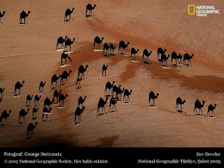This is a picture taken from directly above these camels in the desert at sunset. It is considered to be one of the best pictures of the year. When you look closely, you can see that the camels are the little white lines in the picture.